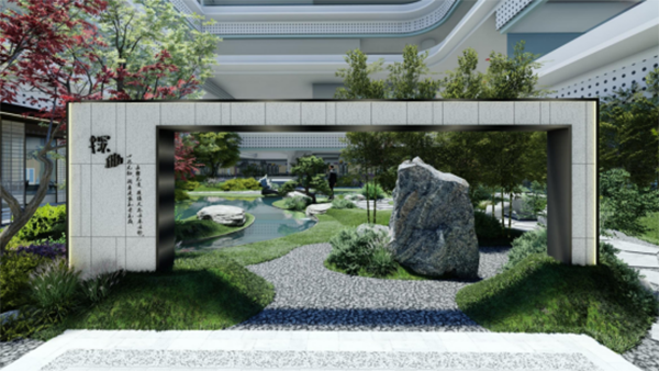 作为集临床、教学、科研、预防于一体的区域性口腔医疗中心,梅江院区在设计上独具匠心。项目创新采用下沉式庭院设计,融入“别有洞天”的中式园林理念,通过山水景墙、拱桥、碎石等自然元素的运用,营造出“四季常绿、三季有花”的疗愈环境。
